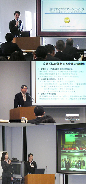 今回は中島 洋氏(MM総研 代表取締役)による講演『〜待ったなしの情報武装〜『日本版SOX法』がBP革新を加速化する』、千金楽(ちぎら)健司氏(株)アパレルウェブ 代表取締役)による講演『成功するWEBマーケティング〜SEOによる集客とマーケティングのポイント〜』を語って頂きました。 また講演後、立教大学の学生によるAIESECの概要説明がありました。 中島 洋氏の横顔 1947年 5月22日生。 1971年 東京大学文学部倫理学科卒業。 1973年 東京大学人文系大学院修士課程修了(倫理学・修士号取得)。 1973年 日本経済新聞社入社、編集局産業部。 1981年 日経マグロウヒル社(現日経BP社)に出向。 1984年 日本経済新聞社復帰。 1988年 日本経済新聞社編集委員。 1997年 日本経済新聞社退職。 アスキー特別顧問(経営会議メンバー)、 アスキー未来研究所・代表取締役所長。 1997年 慶應義塾大学教授(大学院政策・メディア研究科特別研究担当) (〜2002年3月)。 1998年 日経BP社編集委員。 1999年 二十一世紀産業戦略研究所・副所長。 2001年 国際大学グローバルコミュニケーションセンター教授。 (〜2004年3月)。 2003年 MM総研(旧・マルチメディア総合研究所)代表取締役所長。 現在に至る。 千金楽(ちぎら)健司氏の横顔 1960年 2月生。 1982年 中央大学商学部卒業。 1982年 株式会社東京ダンケ入社。 1995年 同社 専務取締役就任。 2000年 株式会社アパレルウェブ設立。同社 代表取締役就任。 2004年 東京商工会議所「勇気ある経営大賞」受賞。 現在に至る。 |
